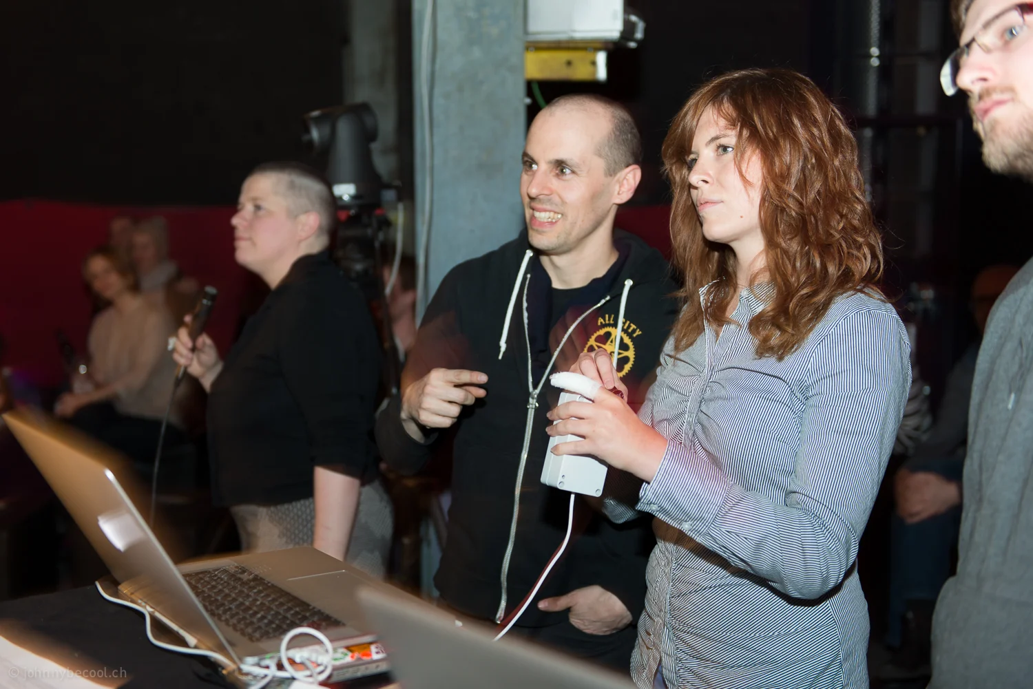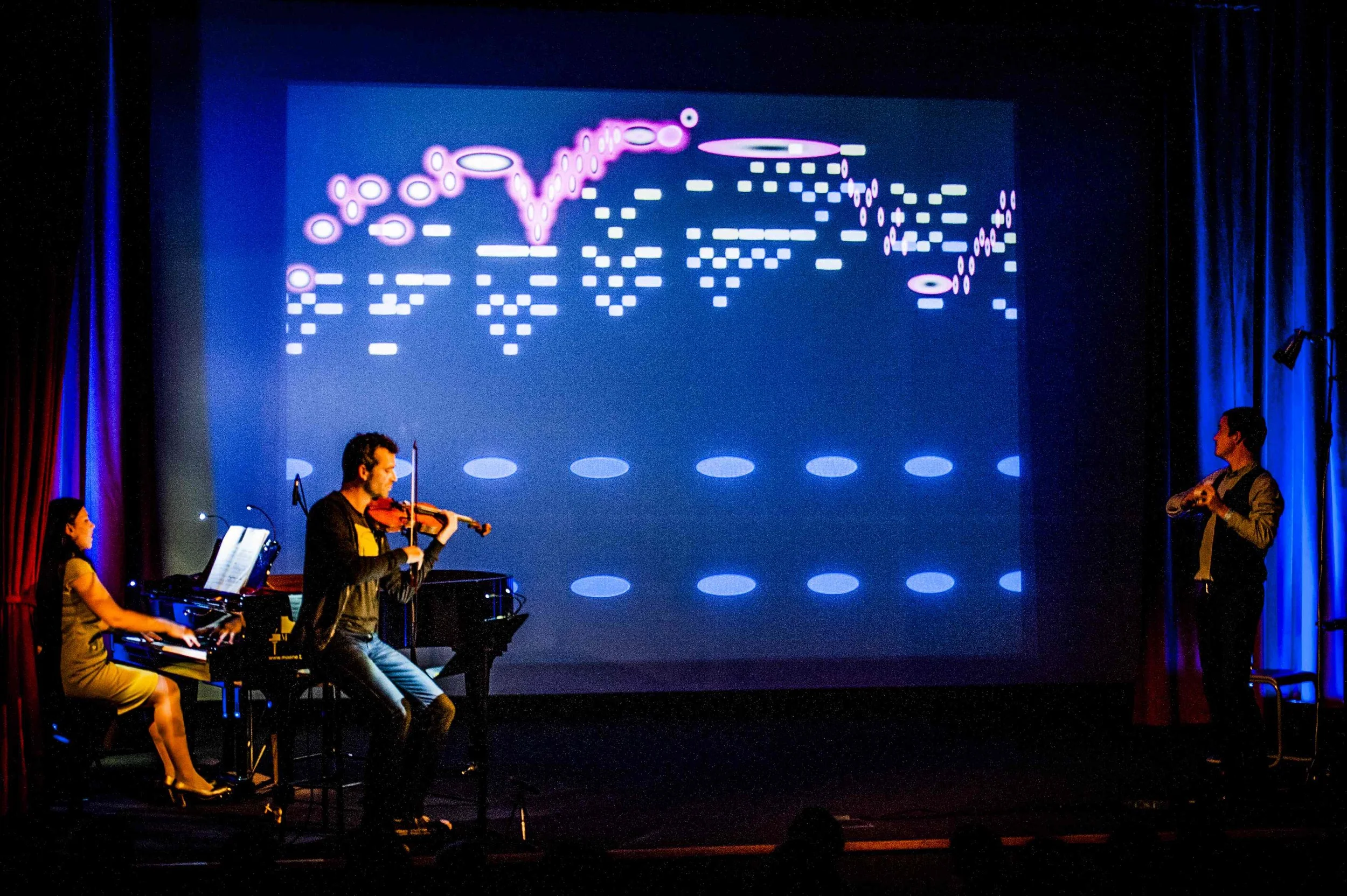 Process: Doors open an hour before the first live act, soft electronic music welcomes guests. The choice of electronic music and transitions to the live acts is specifically designed for each program. Two to three live acts of about 30 minutes each are at the center of the evening. Each of them is introduced by the host who provides the context, introduces and interviews the musicians. Between the live acts, the DJ takes over and creates a sense of space so the guests get refreshed and ready to focus intensely on the dense live acts again. VJ Jones Mettler selects visual material specifically for each program and improvises during the live acts and in the short DJ sets between them. In the second live act, the Music Animation Machine is presented. The audience is invited to try the tool in a short workshop between live acts after which one audience member joins to musicians of the evening in a short performance of a short piece. Sometimes the last DJ set leads to a dance party. More information about the Music Animation Machine live here.